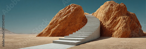 Surreal conceptual landscape featuring a smooth concrete staircase winding up a dusty desert path between massive, rugged orange rock formations, symbolizing ascent, challenge, and future goals.