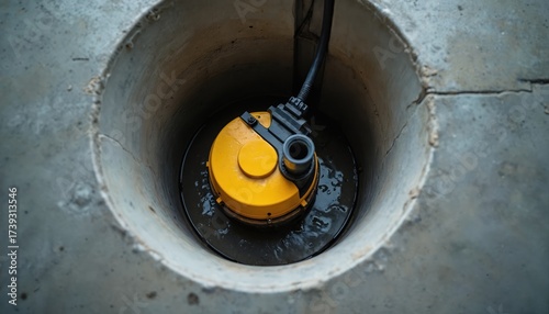Yellow sump pump submerged in murky water within concrete pit. Device prevents basement flooding, aids in water removal and property protection. Utility equipment detail.