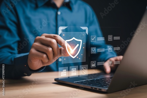 Quality Assurance and Certification Compliance Concept. Woman touching standard quality control certificate assurance guarantee for automation process. quality control management, Audit Documentation
