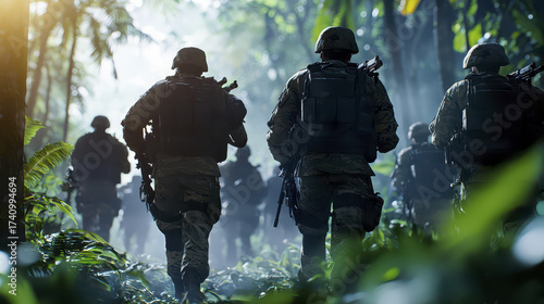 Cinematic shot of soldiers moving through dense jungle foliage, showcasing teamwork and determination serene yet tense
