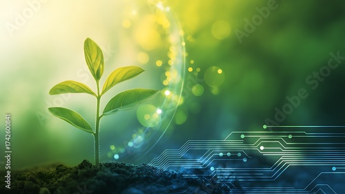 Green Plant Sprout with Technology Background Represents Sustainable Development and Innovation