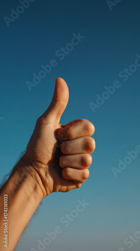 Thumbs up hand gesture close up against clear blue sky, positive and encouraging mood