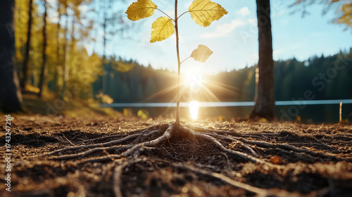 Young tree with vibrant leaves stands tall, its roots visible soil, illuminated by sunlight