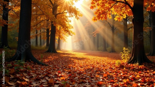Golden Sunlight Illuminates a Path Through an Autumnal Forest, Casting a Magical Glow on Fallen Leaves and Majestic Trees
