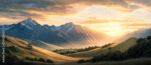 Breathtaking mountain landscape at sunset, with golden light illuminating rolling hills and peaks. scene evokes sense of peace and natural beauty, perfect for outdoor enthusiasts