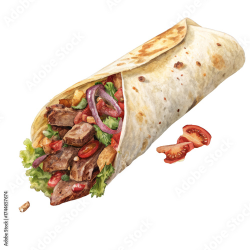 Watercolor Shawarma durum doner kebab with meat isolated on a transparent background