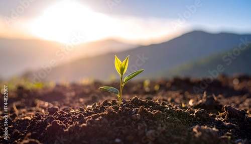 Brote verde creciendo en tierra fértil al amanecer simbolizando esperanza, vida y nuevos comienzos en la naturaleza