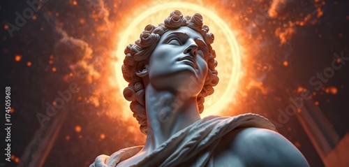 Apollo sculpture bust on sun background. Ancient Greek god of sun and poetry. Symbol of classic art and culture. Creative illustration of antique statue for modern media trends.