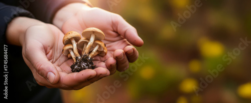 Person holding freshly foraged wild mushrooms in cupped hands. Autumn harvest in a forest with a blurred background. Natural food and mycology concept
