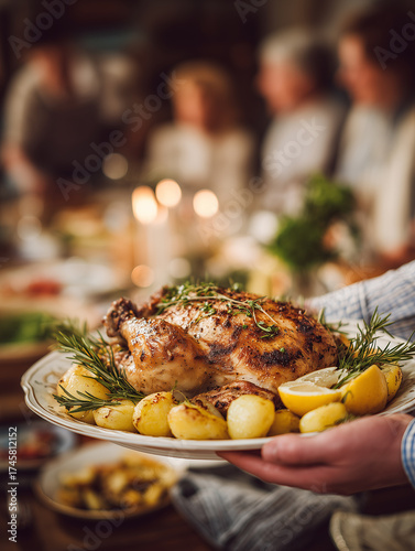 Podanie na stół złocistego, pieczonego kurczaka z ziemniakami, cytryną i rozmarynem. W tle, rozmazani goście i światło świec tworzą ciepłą, świąteczną atmosferę.