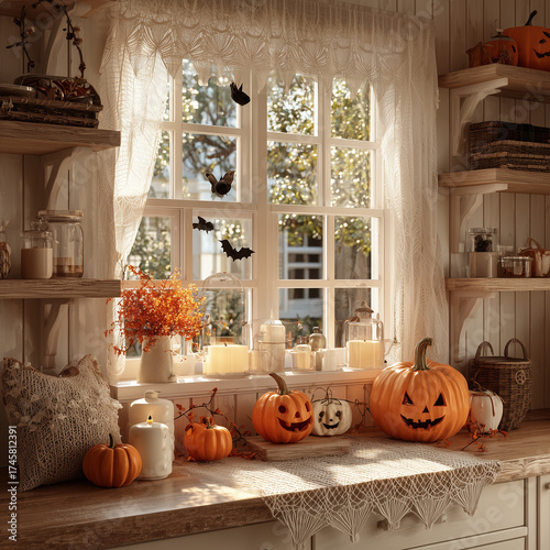 Halloweenowa dekoracja kuchni: dynie z wyciętymi twarzami, świece, pomarańczowe kwiaty i wiszące nietoperze na tle okna z koronkowymi firanami.