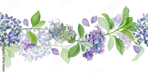 Seamless border with purple and blue hydrangeas. Watercolor summer flowers and petals isolated on a white background. Good for wallpaper, fabric and greeting cards.
