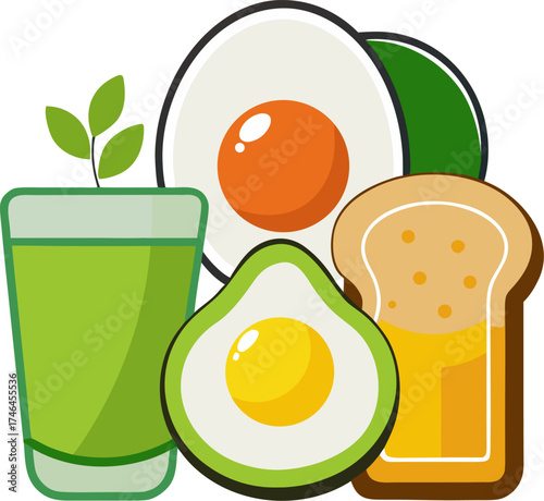 Egg with toast, avocado, and juice in flat style. silhouette vector icon , white background