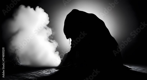 Monochrome silhouette of a mysterious figure shrouded in mist, evoking a sense of intrigue and suspense in the darkness of the night