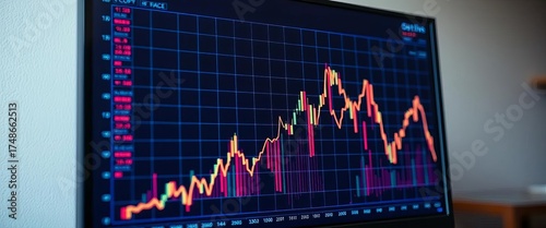 #1483973598A digital graph displays a downward trend in red, indicating a significant decline in values, possibly related to stock or market performance.
