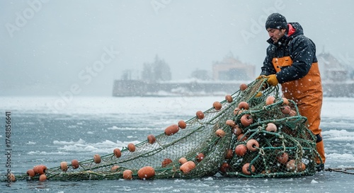 Solitary Fisherman in the Harsh Weather: A resilient fisherman, undeterred by the wintry elements, diligently tends to his fishing net near a serene body of water.