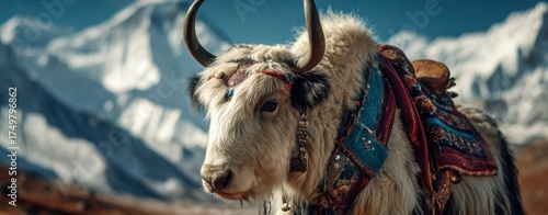 Majestic Yak Amidst Mountains: A sturdy yak, adorned with traditional trappings, stands proudly against the backdrop of towering, snow-capped mountains.