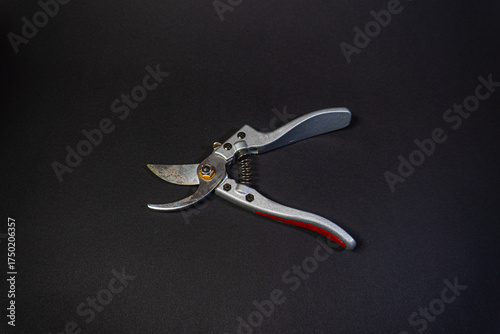 Studio photo of pruning shears on dark background, commercial use.