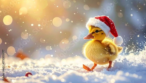 Ein gelbes Entenküken trägt eine kleine rote Mütze, watschelt durch glitzernden Schnee
