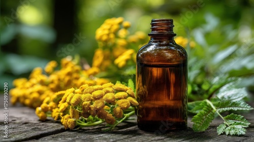 Tanacetum vulgare (Tansy) essential oil bottle on a wooden stump among bright yellow flowers