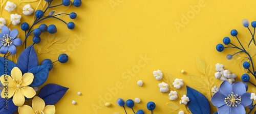 Yellow background with decorative blue and white flowers and berries