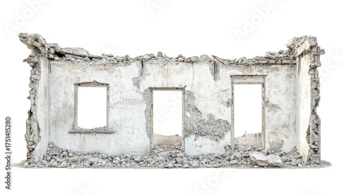 Crumbling wall with three window openings against a black background