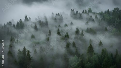 Mystical forest shrouded in dense fog creating a moody, atmospheric landscape scene
