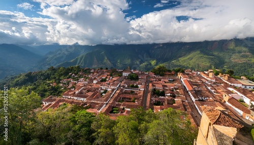 aerial view panorama of historic town barichara colombia situated on a cliff edge with white cloud covered mountain ridge in background