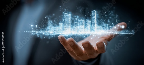 Hand is holding a cityscape in the air. Concept of wonder and awe at the vastness and complexity of urban life