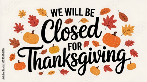 We will be closed for thanksgiving festive autumn holiday announcement with pumpkins and falling leaves