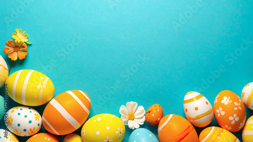 Gelbe und orange Ostereier mit Blumen auf türkisfarbenem Hintergrund