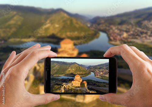 Travel concept. Hands making photo of Jvary monastery near Mtskheta, Georgia.