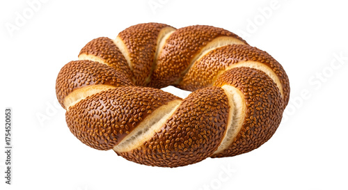 Round Turkish simit bread with sesame seeds isolated on white background, perfect for breakfast themes.