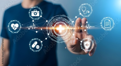 Hand interacting with a futuristic medical technology interface, symbolizing digital health solutions