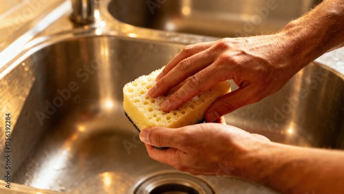 Hands wiping a yellow sponge in a stainless steel sink after cooking, preparing the kitchen for cleanup