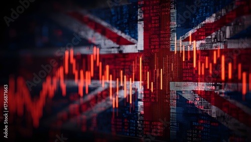 Abstract representation of the united kingdom flag overlaid with a fluctuating financial market graph showing economic trends and data analysis