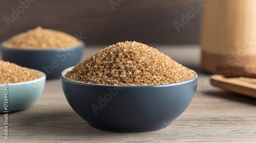 On a rustic wooden table, two wooden bowls filled with granulated brown sugar are situated under a warm lamplight, which contributes to a cozy and inviting environment