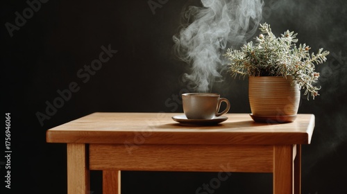 A dimly lit room is made peaceful by the combination of a steaming cup of coffee and a lush potted plant that are situated on a sleek, minimalist wooden table, creating a calm atmosphere