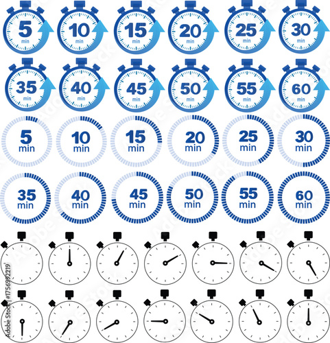 stopwatch set for every 5 to 60 minutes icon set. countdown analog timer deadline Set. Clock dial with showing minute in four style can be use for app. vector illustration on white background.