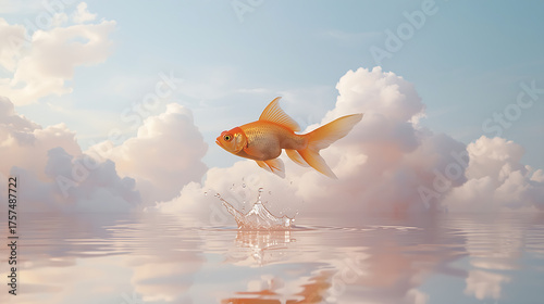 A surreal fantasy scene features a graceful goldfish swimming in pastel colors, surrounded by a fluffy white cloud, creating a peaceful and imaginative atmosphere.