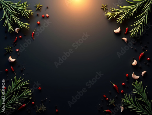 Dark Culinary Frame with Rosemary, Chili, Garlic