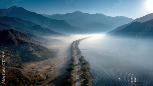 Solar road generates clean energy amidst misty mountains and serene landscapes