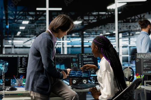 Team leader helping intern in data center to use AI LLM assistant to do maintenance on rigs. Manager and trainee doing internship in server hub, using large language model chatbot to do backups