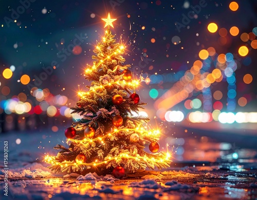 Choinka oświetlona lampkami. Bożonarodzeniowe tło