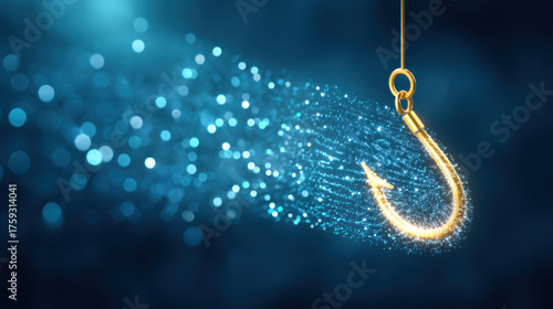 Phishing concept digital bait hook glowing gold particle trail cyber security threat lure online deception