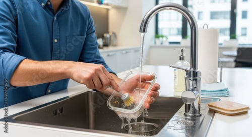 Washing lunchbox for work at kitchen sink with running water. Washing lunchbox after preparing a meal, and washing lunchbox after eating a lunch meal ensures cleanliness,
