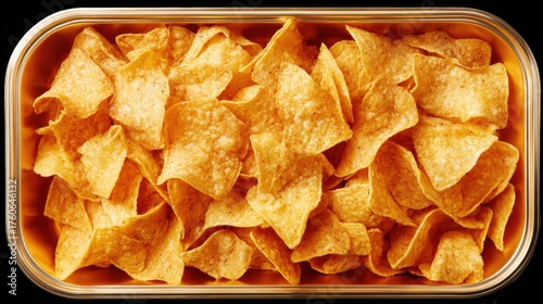 Rectangular plastic container filled with tortilla chips. the chips are golden brown in color and appear to be freshly made.