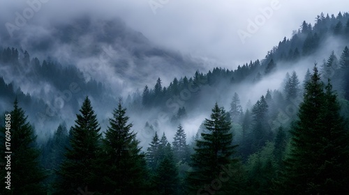 A dense evergreen forest shrouded in mist on a mountain slope at dawn