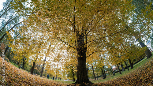 Majestatyczne drzewo jesienne w parku, ujęcie z niskiej perspektywy.