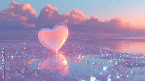 Cute dreamy scene with soft pink heart balloon floating above sparkling purple and blue landscape under pastel sky with glowing clouds